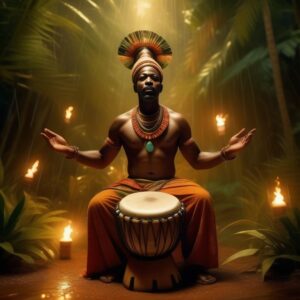 Das Trommeln ermöglicht es mir , mich auf einer tieferen Ebene mit Baron Samedi zu verbinden. Es ist eine gemeinsame Sprache, die jenseits der Worte liegt. Die Schwingungen der Trommeln durchdringen meinen Körper und öffnen den Kanal für Baron Samedi, um durch mich zu sprechen. Es ist eine transzendente Erfahrung, in der ich mich mit seiner Weisheit und seinem Wissen verbinde.